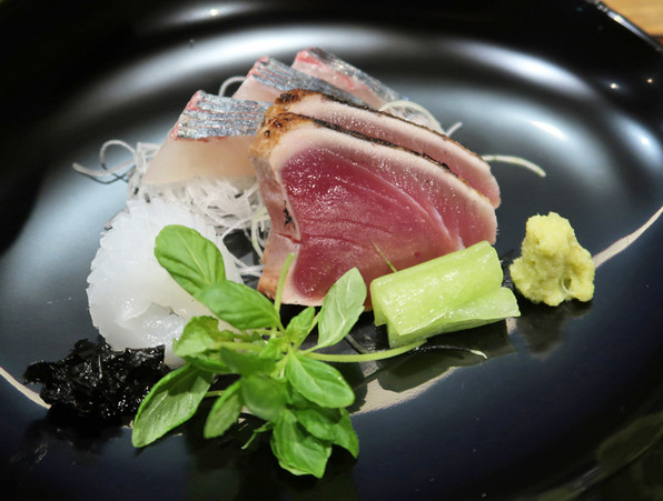 ●かつお炙り、あおりいか、ひらまさ。青ずいき。