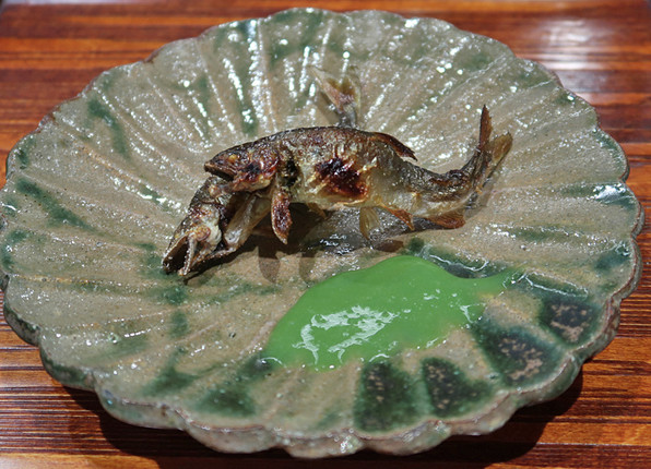 ●琵琶湖の若鮎の塩焼き、たでソースと。