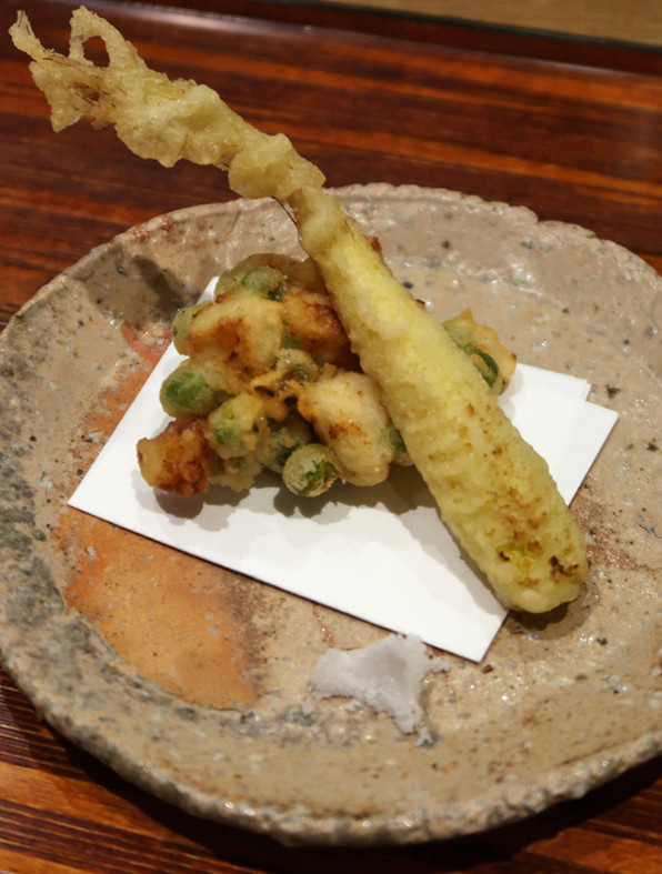 ●うすい豆と帆立のかき揚げ、ヤングコーンの天ぷら。