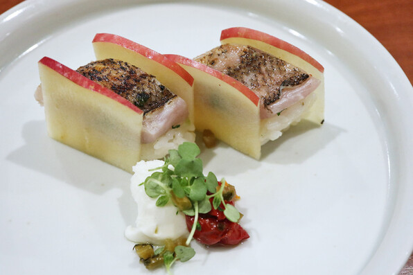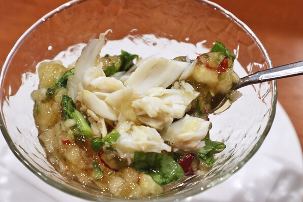 ●こっぺ蟹きゅうりとりんご入りの柑橘酢ジュレ。