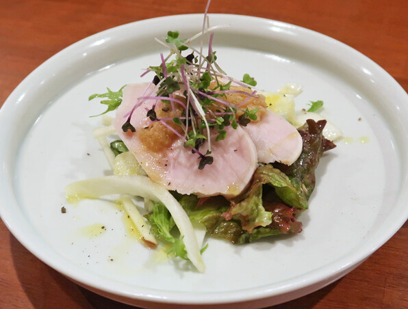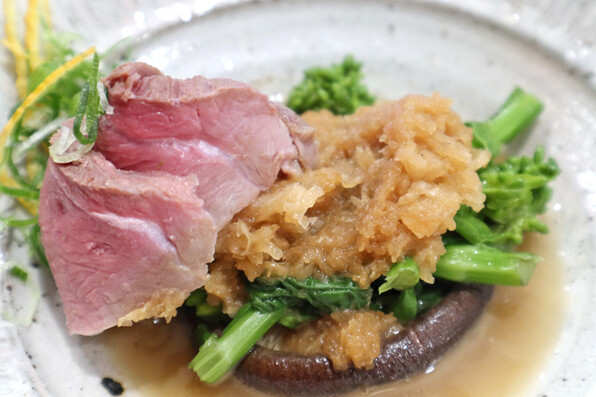 ●鴨肉と原木椎茸のソテ、菜花、おろしポン酢バターソース