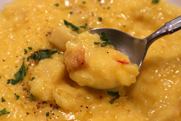 ●リゾットは燻製帆立貝柱のチーズリゾット サフランの香りで。