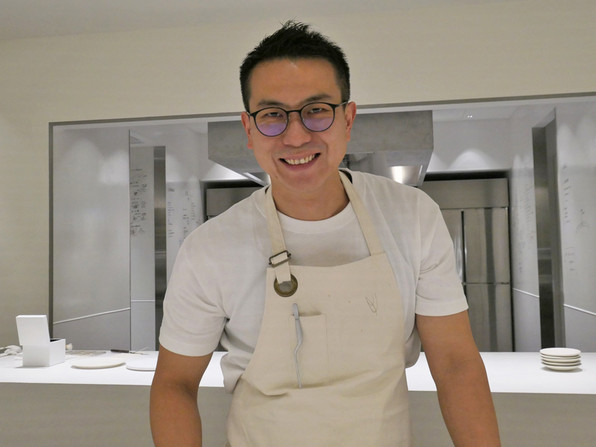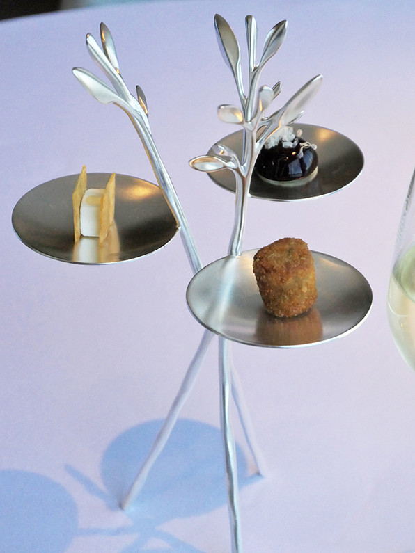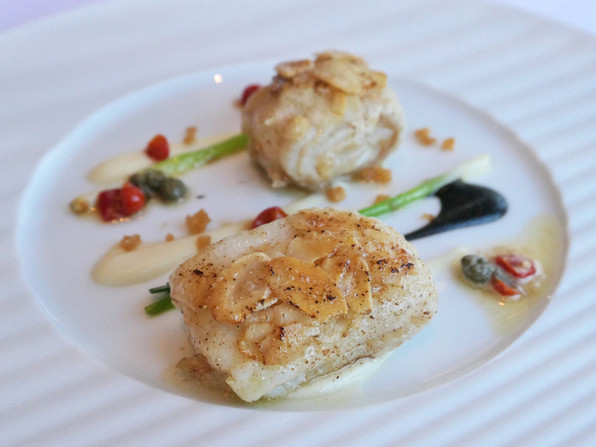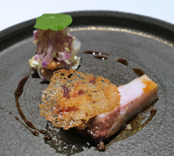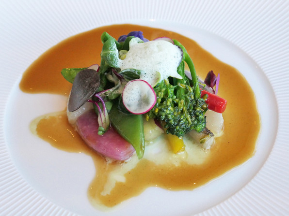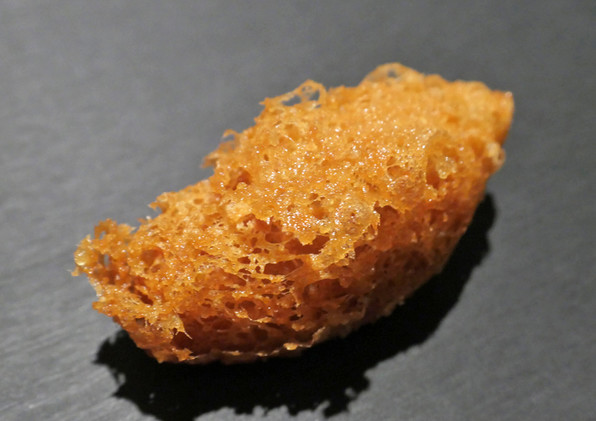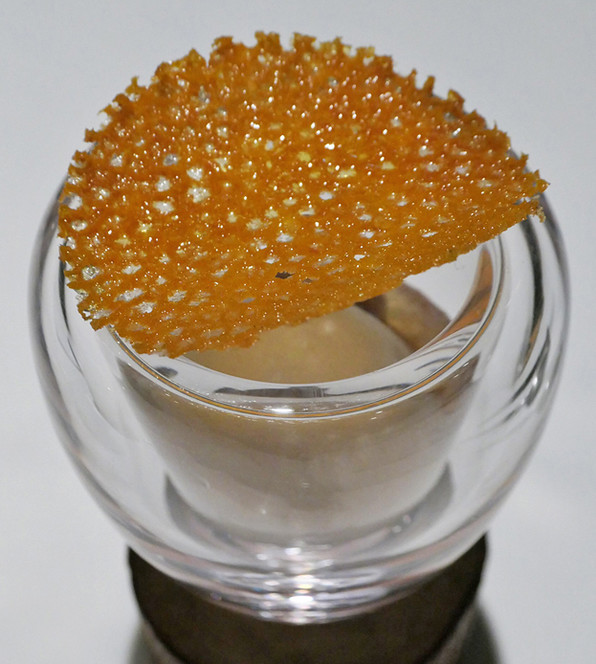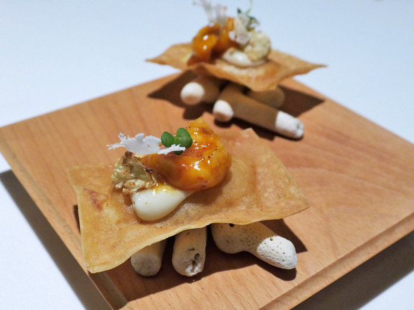 7)天然鯛にバーニャソース、姫柚子の皮、レースの形に作った玉ねぎのテュイル。フィッシュ&チップスとのこと。