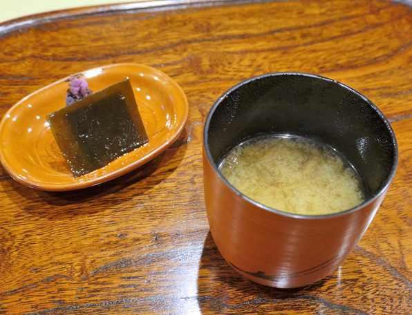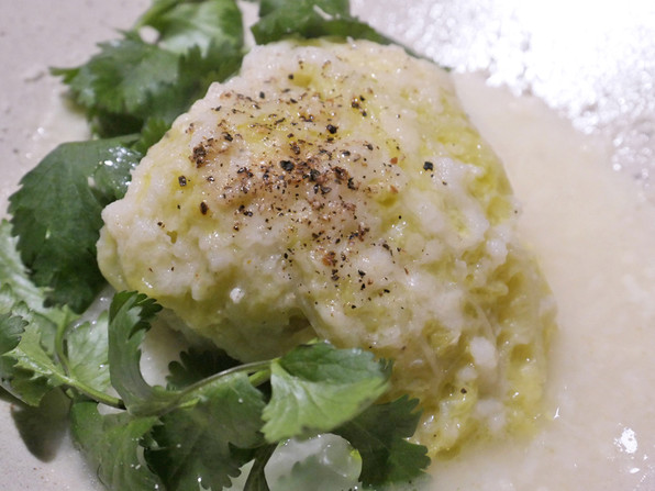 ●亀岡のかぶらを使ったみぞれ椀、白甘鯛、堀川ごぼう、水菜、あられ柚子。