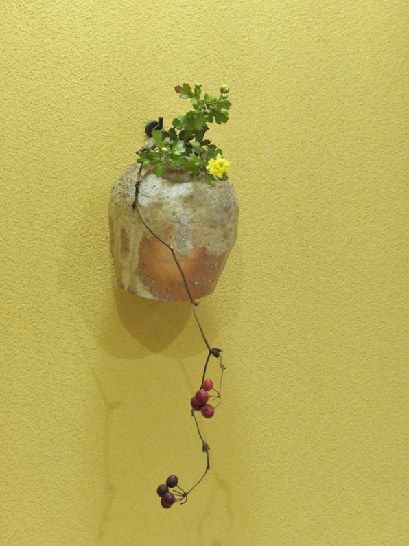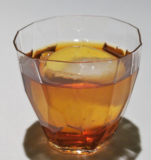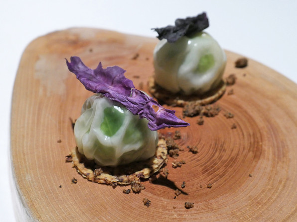 1)ホワイトチョコレートで覆った、生姜が香る柚子ジュース。ジュースは半ば凍った状態。与謝野の野草と共に。