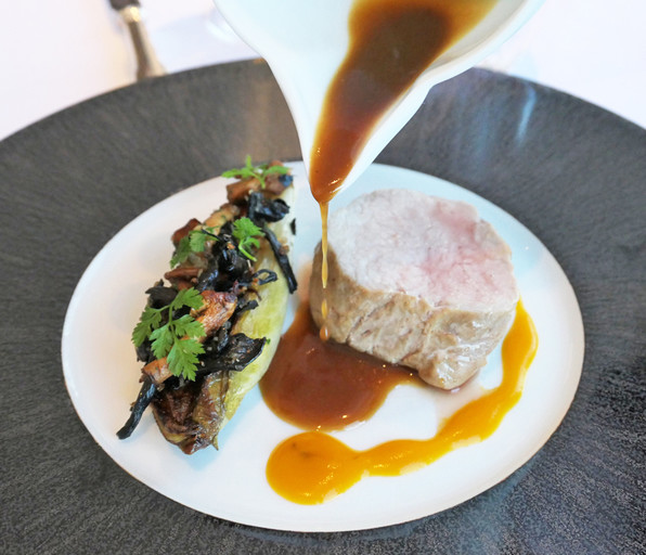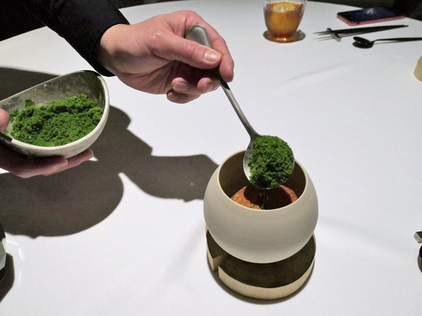 4)きのこロールケーキ、きのこクリームソース。上からブラウンマッシュルームのスライス、パウダーは発酵させた椎茸を粉々にしたもの。ここにアルバの白トリュフ上から。