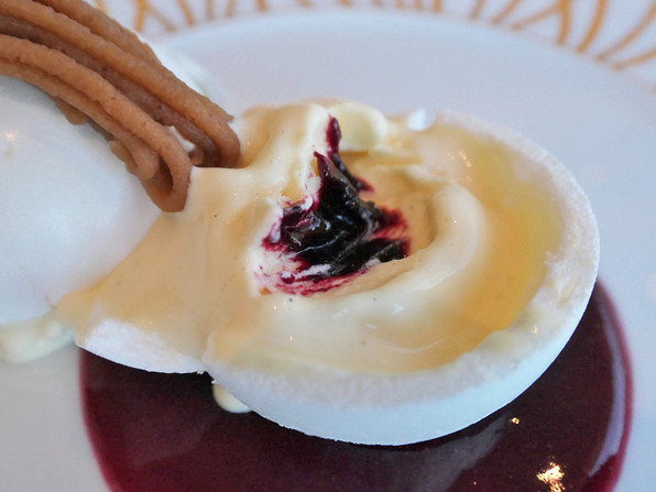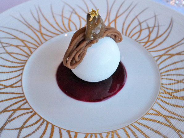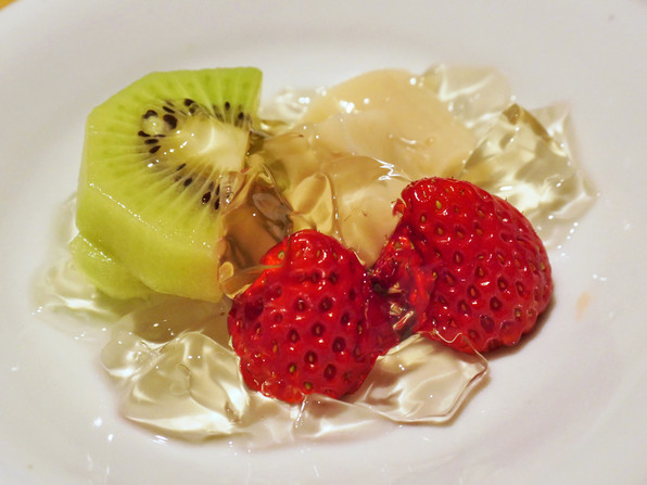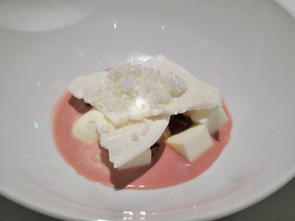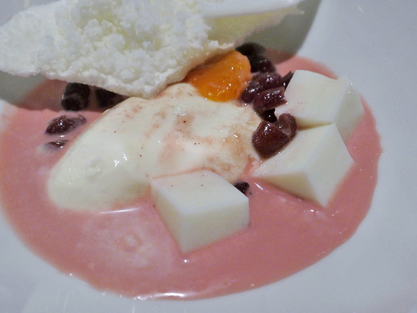 ●紅玉のソルベ、下に白味噌のブランマンジェ。太白胡麻油。フルーツいろいろ(ル・レクチェ、紅まどんな、さがほのか)