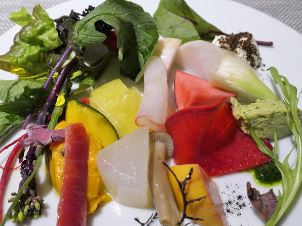 8)やいとかつおのカルパッチョ、オータムポエムの葉をジュリエンヌにしたもの、花と。