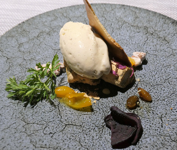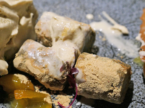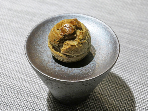 3)フォアグラ大福。生地はサフランの黄色。中にフォアグラのムース、発酵柿、上から昆布茶シロップ、ディル。