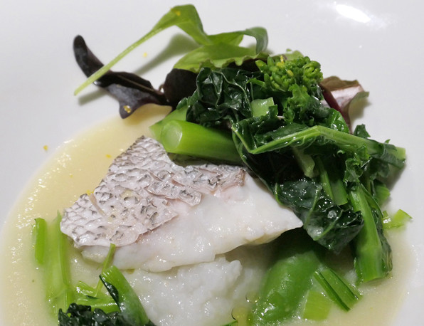 16)白身魚はひらすずき。低温調理=真空調理。オータムポエムの、茎とつぼみを魚醤で和えたもの。