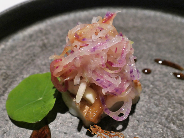 11)帆立カルパチョと自家製生ハムを重ねたもの、バジルのつぼみを塩漬けしたものの素揚げ、マイクロセロリ、上からケールオイル。