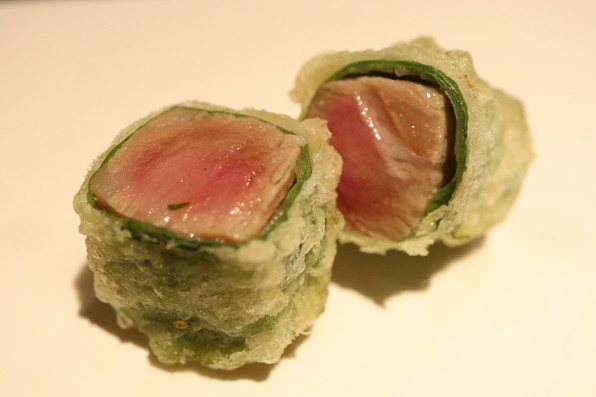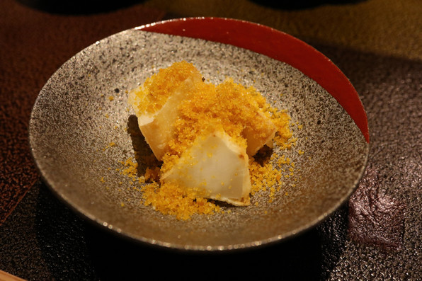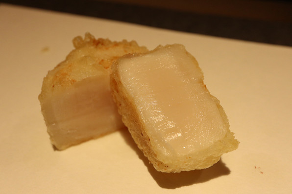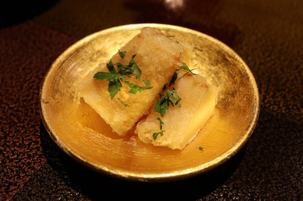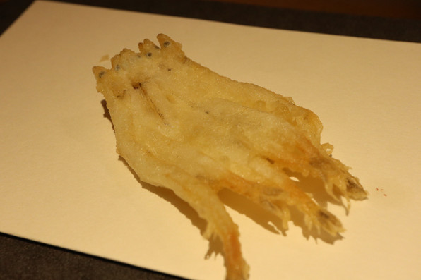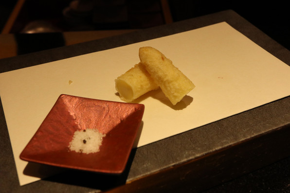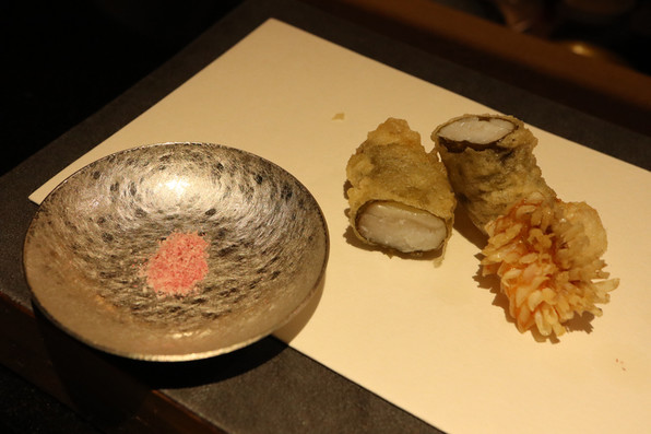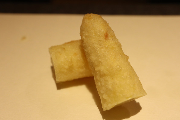 12)雲子のフリット、湯葉、上から九条ねぎの白い部分オイル