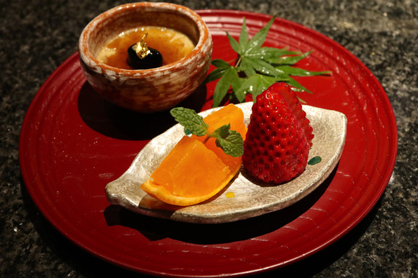 ●最後の甘味はほうじ茶プリンに黒豆、せとか(柑橘)とまりひめ(苺)でした。