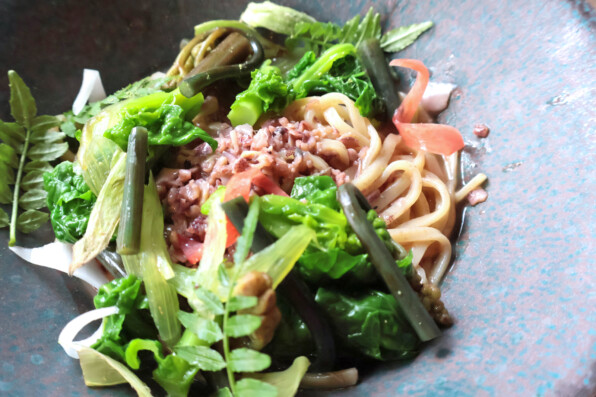 山形の芹の炭火焼き、まこも茸、胡桃、わさび。