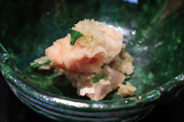 ●ひと品目、「明鏡止水」、美しい名前の大吟醸酒をひと口食前酒にいただきお料理スタートです。