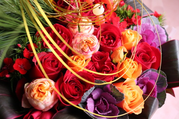 ■ お花は、お正月用にみなちゃん=浦沢美奈さん@「プーゼ」に作ってもらったものです。バラのアレンジメントをお正月風に、金色の水引かけてね♪ とお願いしたら、餅花に松葉まであしらわれて大喜び。