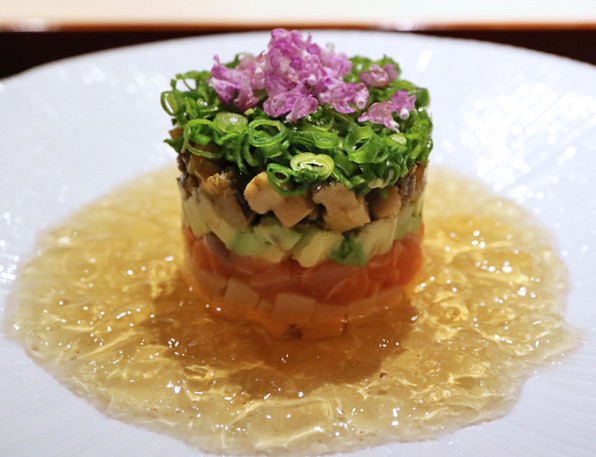●フランス料理のように見える、先付のタルタル仕立て。筍、サーモン、アボカド、蒸しあわび、ねぎ、花穂紫蘇に、土佐酢ジュレ。