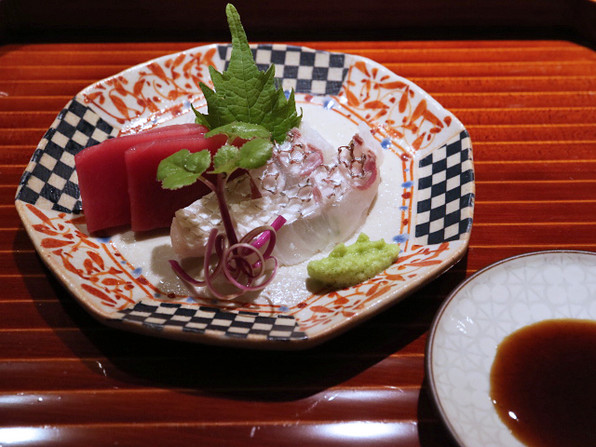 ●お造りはボストンのまぐろに、瀬戸内の鯛、松皮造りです。