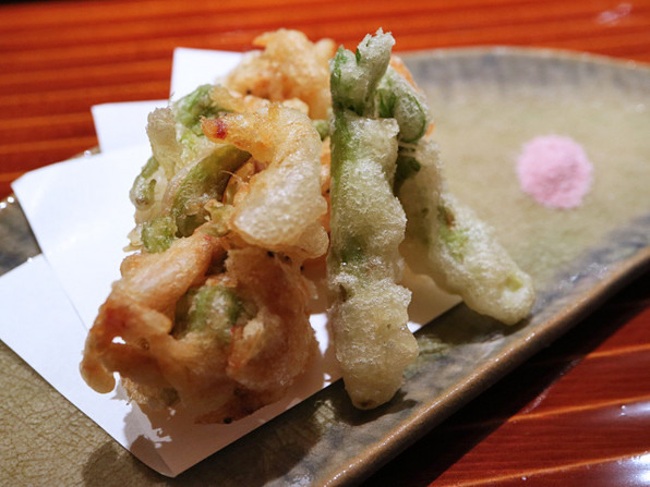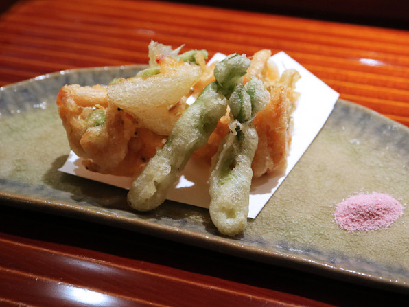 ●油物は駿河湾の桜海老と玉ねぎ、ふきのとうのかき揚げ、手前にたらの芽の天ぷら。添えられているのは桜塩です。