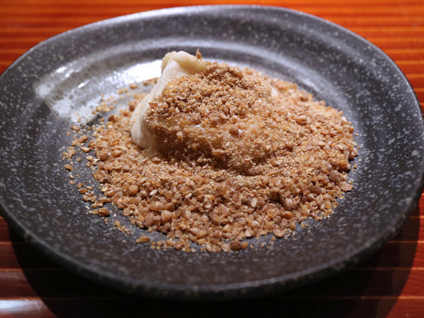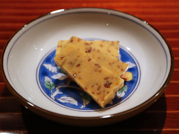 ●焼胡麻豆腐です。わわ、これははっきりとモデルがわかりますね・・・ 笑。かけられた切り胡麻の中に蕎麦の実が混ぜ込まれ、ガリガリとした食感があります。これは好みが分かれると思います。