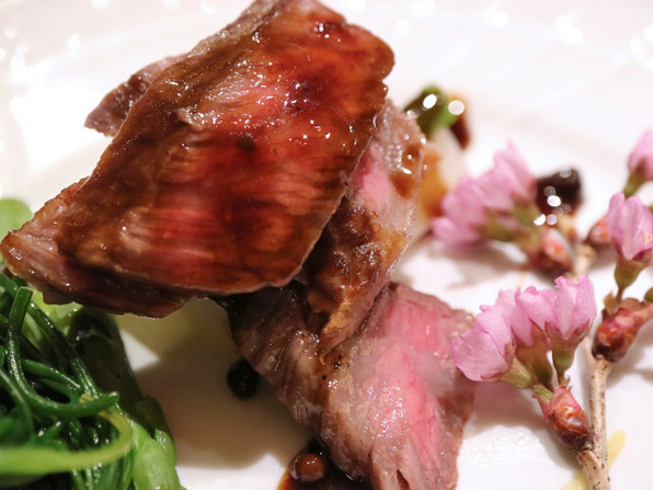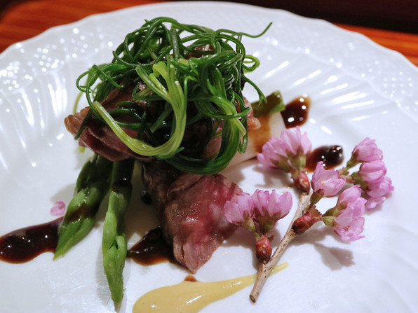 ●丹波牛、いちぼ肉の炭焼き、旨だし仕立て。白うど、グリーンアスパラガス。山椒が効いたバルサミコソース