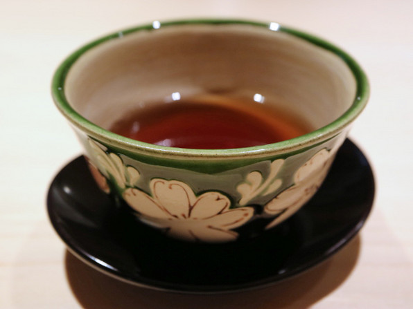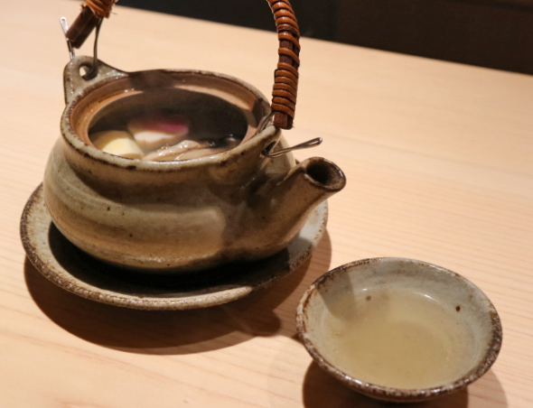 ●お椀は、はまぐりと帆立のしんじょう、筍、菜の花。海藻は「ほんだわら」、神馬藻(じんばそう)ともいうものです。はまぐりだし濃厚です。底ににゅうめんが控えていました。葛を練り込んだつるりとしたお素麺。かなり量感のあるお椀でした。