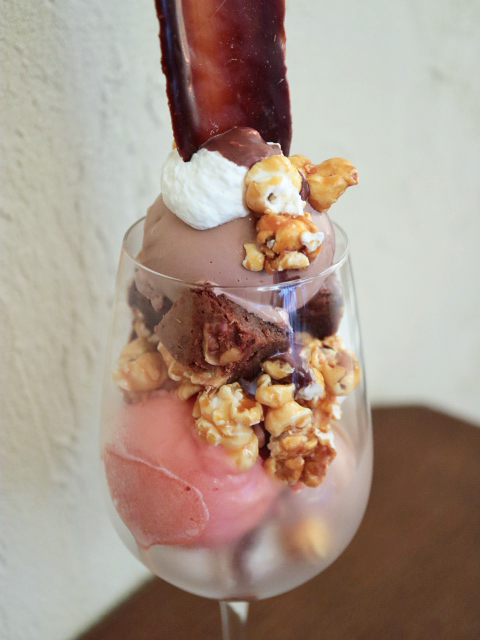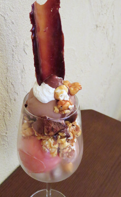 チョコレートのジェラート、ピンク色はオランジュ・サンギーヌ(ブラッドオレンジ)、キャラメリゼしたポップコーン、ブラウニー、アーモンド風味のムラング。