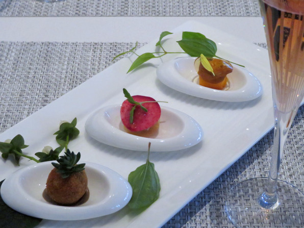 ●「おこしやす」のアミューズ3点盛り、京にんじんと雲丹/京丹波高原豚京都の酒粕(リエット)/京都コシヒカリ 原木椎茸(小さなコロッケ)