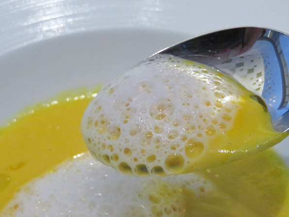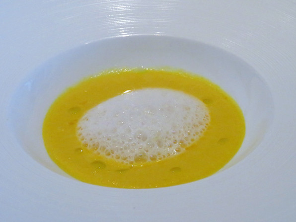 ●黄色にんじんのスープ。玉ねぎの泡。オリーヴオイル、柚子の香り。これ香りよく、しみじみ、圧倒的に美味でした。