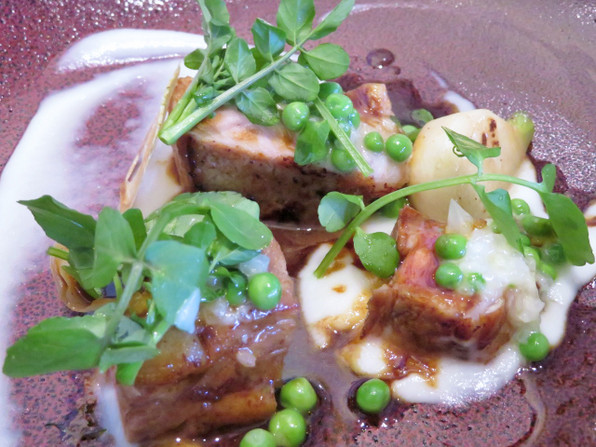 ●肉料理は、「キュイジーヌ トラディショナル」とタイトルがついて出てきて(フランス語的には、トラディショネルでお願いしたい。笑)、こちらは仔牛のローストです。新玉ねぎのピュレと。クレソン、蕪、うすい豆も肉の味を引き立てて、ほんとーにおいしい☆☆☆