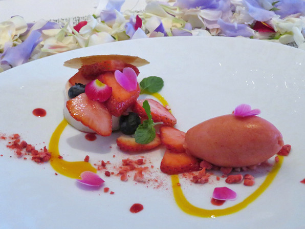 ●誕生日プレートを友人のために用意してくださって、春色のデセールを出してくださいました。奥に隠れていますがほんのり薄ピンクなのが桜のムース。花びらをまく演出まで。感謝しました。