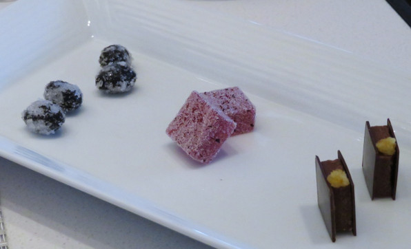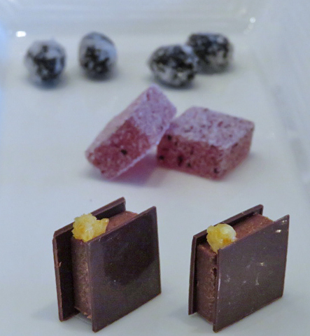 ●もちろんショコラからいただきました。水尾の柚子が香る粋なショコラでした。奥が大原の赤紫蘇のパートドゥフリュイ、丹波黒豆の砂糖漬け。