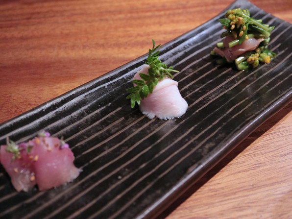 ●ひと皿め、鶏むね肉3種盛りのうち、とりわけ昆布締めが目ざましく美味でした。ほんとにぱっと目が醒める思いがしたのです。蒸し鶏に花山椒、いちばん奥はのらぼう菜(綾部 北村農園)とからし和えにしたもの。