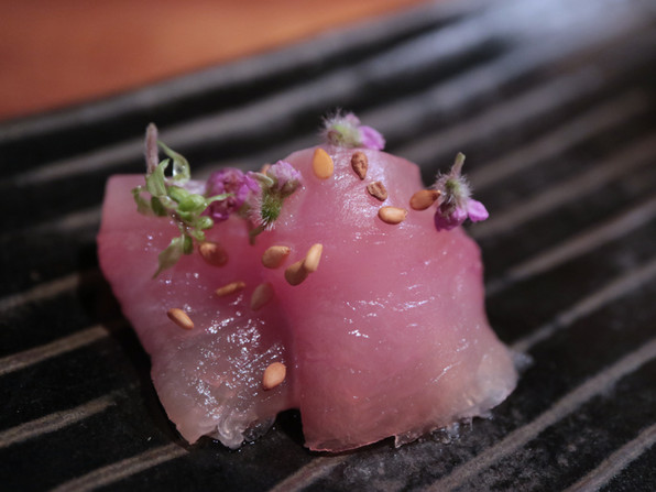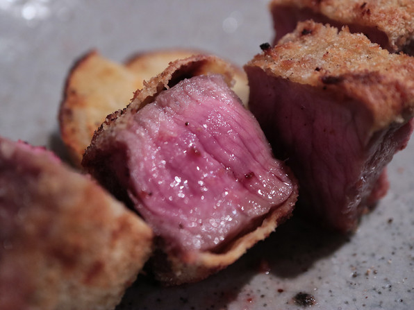 ●牛肉は宮崎の尾崎牛、外もも肉(まくら)網焼きなんだけど、衣が薄くつけられて、加減よく火入れされていました。衣をつけないとパサパサになってしまうからということでした。衣がまた風味あって美味の足し算になっていました。