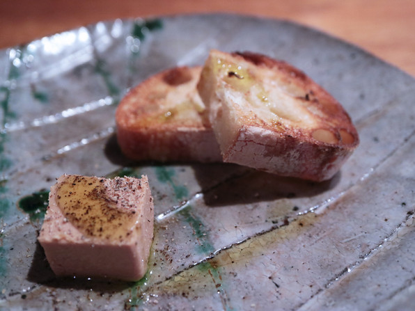 ●バゲットを添えた、鶏レバーのパテ、写真は半分量。バゲットは「花かご」さんですね♪