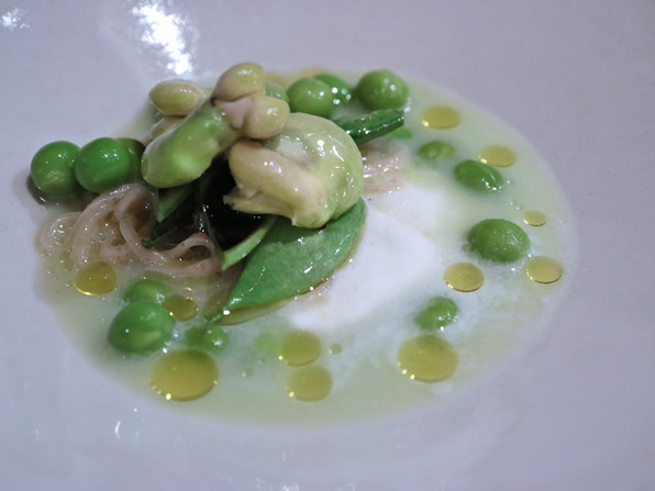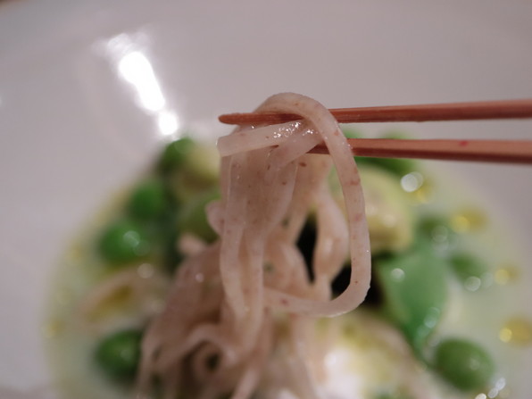●豆と全粒粉のそばも春の香味そのものでおいし。豆はスナップえんどう、そら豆、モロッコいんげん。モッツァレラ、オリーヴオイル。