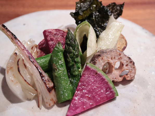 ●野菜焼き11種、香味豊かで充実。いちばん奥の黒いのは黒キャベツ。その手前にフィノッキオ(=フヌイユ、フェンネル)。縦長の玉ねぎはイアリアのトロペア。すべて塩気ほどよく、味わい濃厚でした。