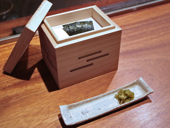 ●熱々の焼海苔の変わらずです。能登の塩と、筍の木の芽とおじゃこ和え。