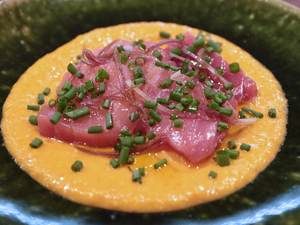 まぐろのカルパッチョの下にはトマトベースの野菜ソース。