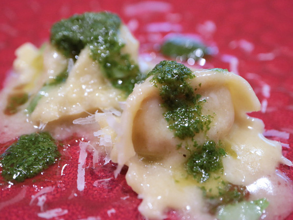●鶏ひき肉と木の芽のアニョロッティ、木の芽ソース