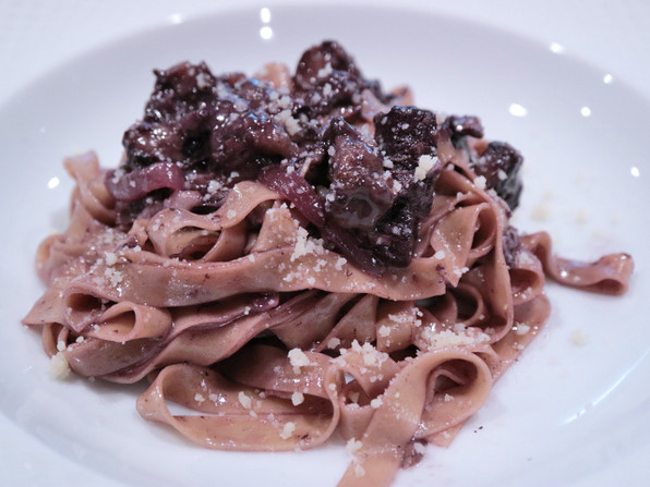 ミートソースの肉はひき肉ではなくて、赤ワイン煮にした牛肉をざくざくと切ったもの。肉食女(男も)喜ぶ肉ソースです。全然トマトっ気はないです。ブフブルギニョンをばらしてからめもって食べるパスタと思ってください。贅沢です♪