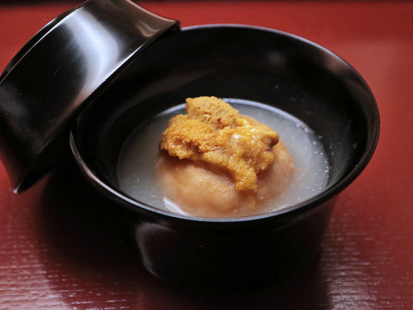 ●うにをのせた百合根まんじゅう、根セロリのすり流し