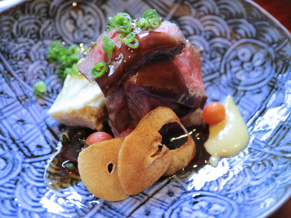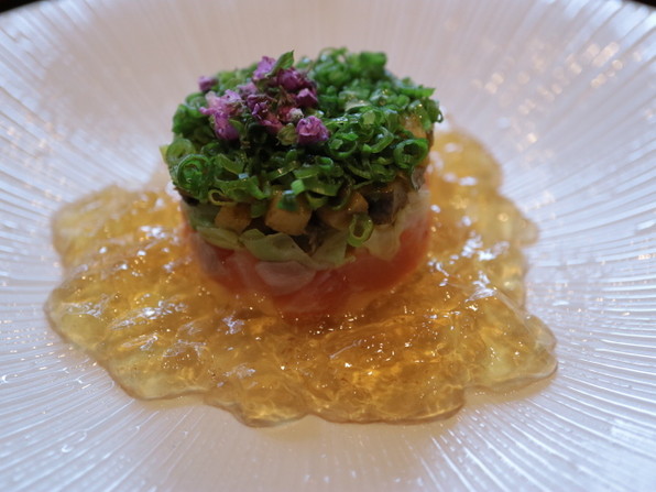 ●蒸し鮑のタルタル サーモン、新キャベツ、山芋 土佐酢ジュレ