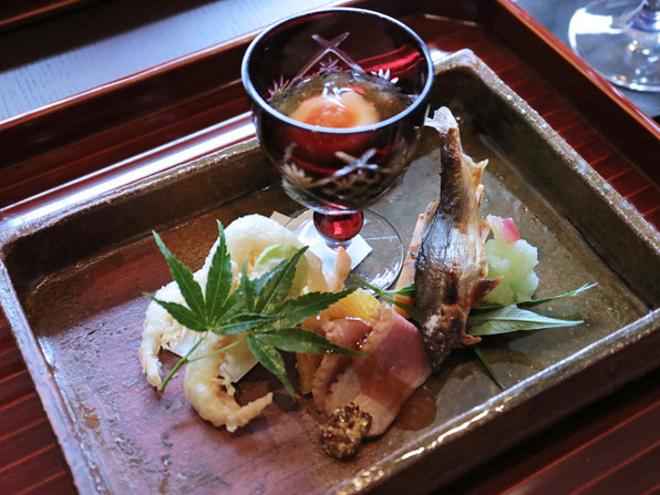 ●八寸は、稚鮎炭焼き、蓼おろし/ちりめん山椒チーズ/京鴨ロースと甘夏/白海老、そら豆の薄衣揚げ