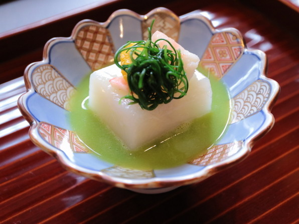 ●白アスパラガス豆腐をおしのぎに。うすい豆あん 海老、おかひじき、ズッキーニ