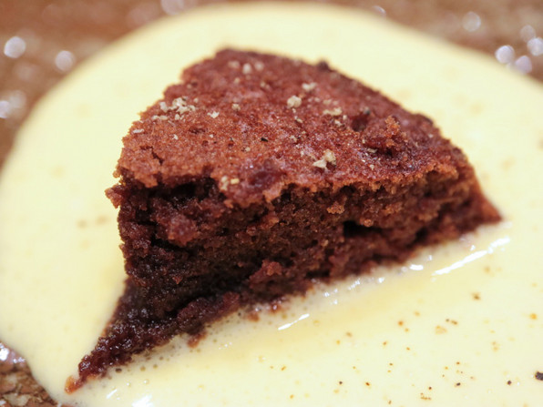 (焼きたてショコラのフィナンシエ、パッションフルーツのソース)