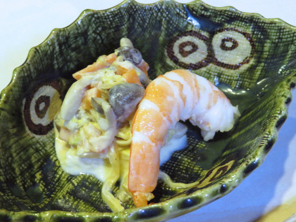 ●先付 海老、白菜、しめじ、にんじん、湯葉の胡麻和え