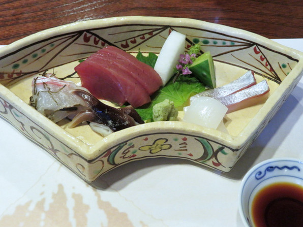 ●向付 鯛昆布〆、しまあじ、とり貝、かつお、剣先いか、野菜