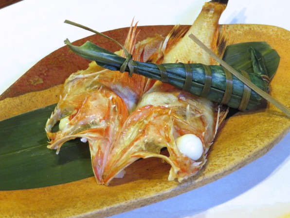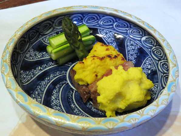 ●蒸物 ふかひれ、焼茄子、うすい豆あん