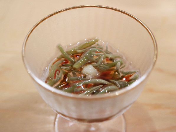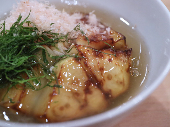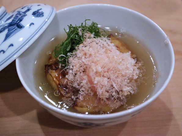 ●ご飯前の最後の一品、焚き合わせです。賀茂茄子です。